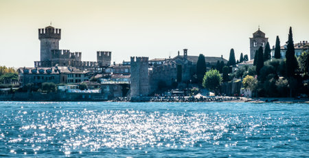 The bright azure Lake Garda with preserved medieval wall of Scaligero Castle, Sirmione, Italy