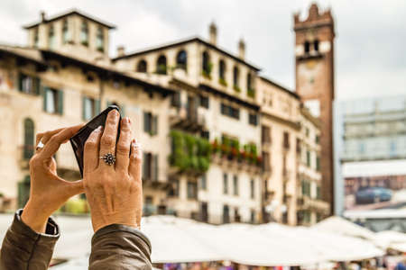 VERONA (VR), ITALY - MAY 10, 2019: tourists visiting The Scaliger Bridge in Verona, city of lovers in Italy