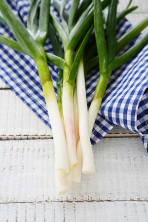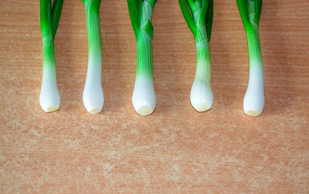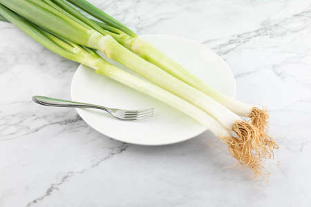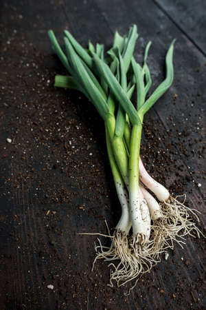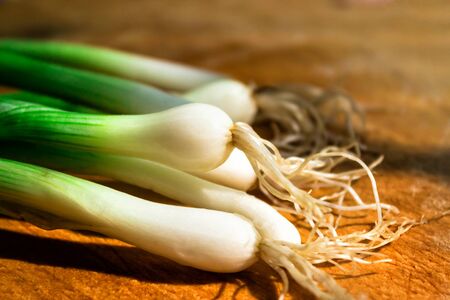 healthy plant-based ingredients, bunch of spring onions with roots on kitchen countertop