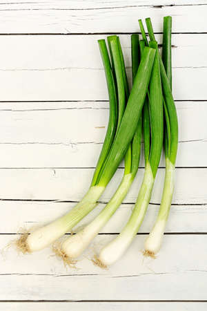 Spring onions also known as salad onions, green onions or scallions on wood background
