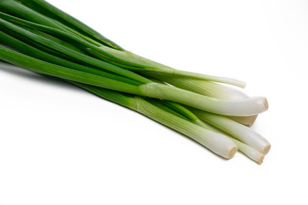 Fresh spring onions isolated on white background. Close up. Shallow DOF.