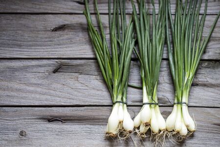 Fresh scallion with root ends on rustic wooden background. Copy space