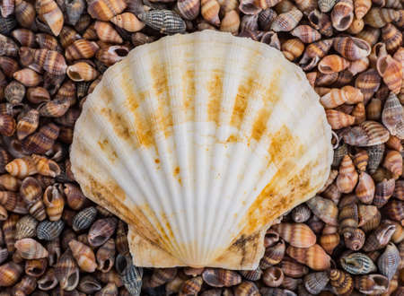 Top view of seashells lying in the sand. Seashell background. Shells on the sandy beach.