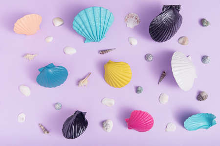Creative summer pattern with colorful sea shells on a purple background. Rectangle layout. Flat lay, top view