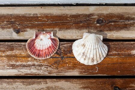 variety of sea shells from beach - panoramic - with large scallop shell.