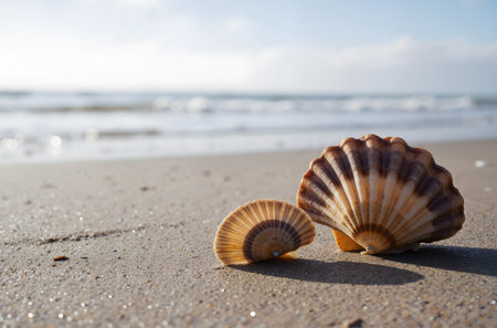 A beautiful scallop shell lies on sandy beach at sunset, with soft waves gently crashing nearby.