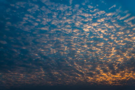 Cumulus clouds, blue sky and the evening sun with sun rays. The clouds in the sky in the form of a grid or lattice. Beautiful sunset. Background pattern of clouds.