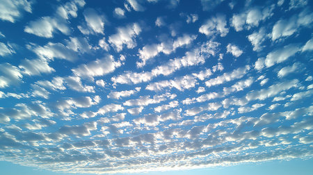 Skyward Perspective Orderly Rows of Cumulus Clouds Stretching Across a Vibrant Blue Expanse