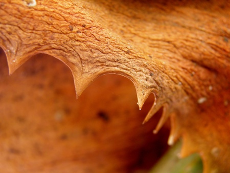 Macro image of dry brown aloe vera leaf with teeth like thorns