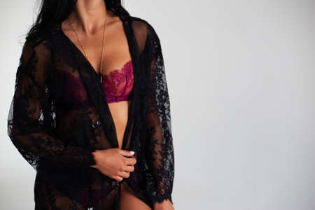 Cropped shot of girl in pink underwear and black robe on white background. Sexy and tender girl and underwear concept.