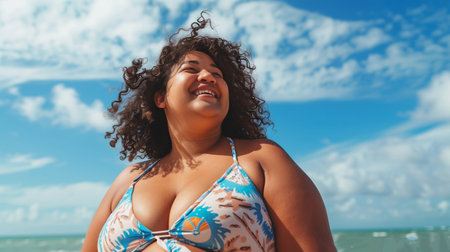 A radiant plus-size woman in colorful beachwear enjoying a sunny day at the beach. Her confident smile and natural beauty shine against the backdrop of the ocean waves and a bright blue sky. This image celebrates body positivity, self-confidence, and the joy of summer vacations