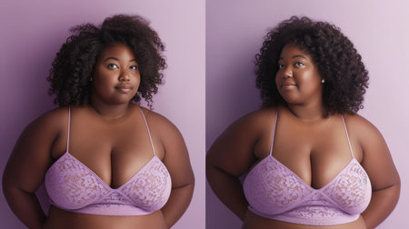 Confident Plus-Size Model in Elegant Lace Lingerie on a Pastel Background