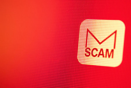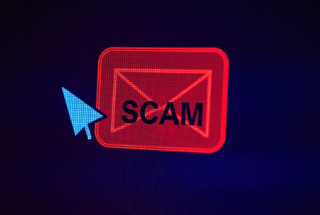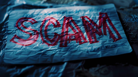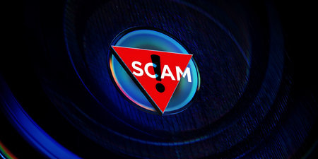 A red triangle with the word scam and an exclamation point on a blue and black background