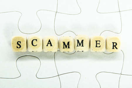 Wood cubes with word 'scam' stacking as step stair on paper blue and white background, copy space. Concept.