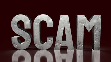 3D rendering concept of anonymous scamming online. Word scam with shadow on ground in red and dark blue background. 3D Rendering. 3D illustration.