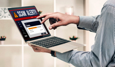 Laptop Computer With Neon Scam Warning On Screen, Online Fraud And Cybercrime Concept