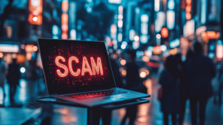 Laptop With A Glowing Neon Sign Reading Scam, Warning Against Internet Fraud In The City.