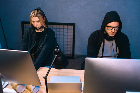 Man wearing black cap and hoodie sitting behind the computer monitor in the dark, looking at computer screen typing, close up, hacking computer system concept