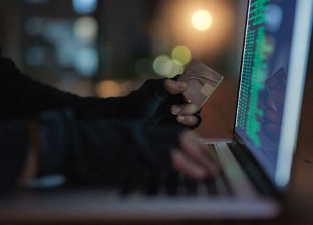 Dont let your credit card out of your sight. Shot of an unidentifiable criminal using a laptop to hack into a credit account.