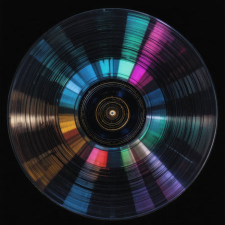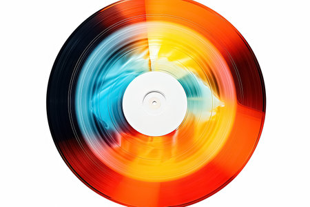 A stunning vintage vinyl record capturing colorful reflections against a white background. Perfect for projects focused on music, nostalgia, and retro aesthetics.