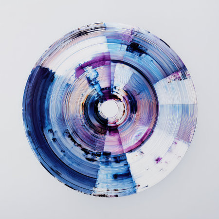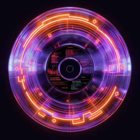 This image features a circular disc illuminated by vibrant abstract colors on a dark background, perfect for conveying themes of music, technology, and modern design.
