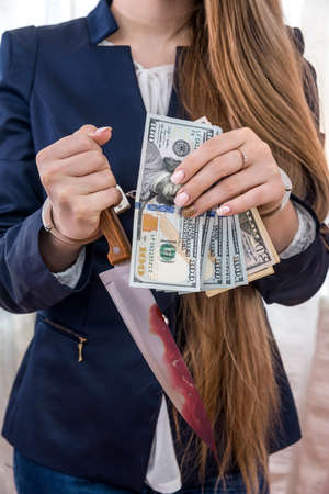 Arrested woman in handcuffs with knife in blood
