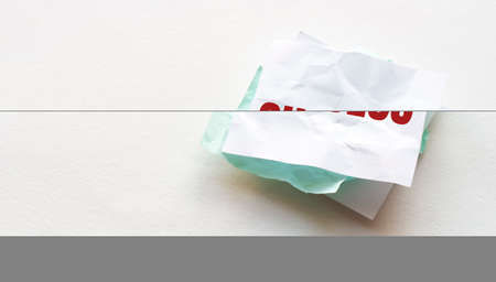 notebook and pen on a wood table, copy space for text, female hand writing SUCCESS on crumpled yellow paper, work place, brainstorming