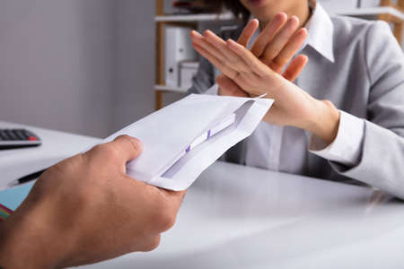 Close-up Of Businessperson's Hand Refusing Bribe Given By Partner In Envelope At Workplace