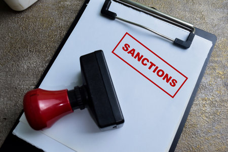Red Handle Rubber Stamper and Sanctions text above paperwork isolated on wooden background