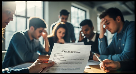 Close-up of a person reading a document with a denied stamp