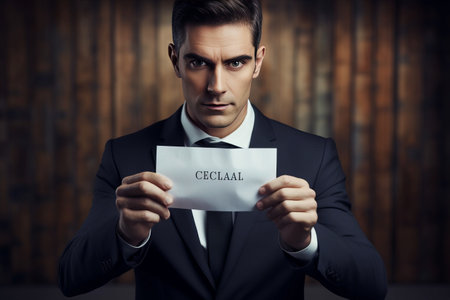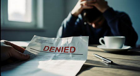 depressed man holding a piece of paper with the word denied on the table
