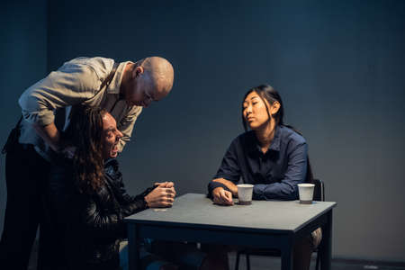 Detective uses force in questioning the accused black man while another female detective reading documents of the interrogation.