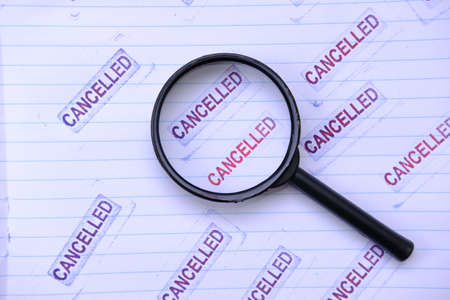 Programme Cancelled written on wooden blocks. Blurred vintage styled background.