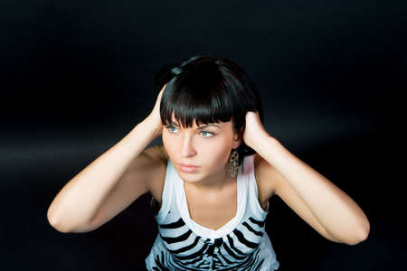 Girl in her mid 20's covering ears, suffering from loud noise, unhappy female feeling pain