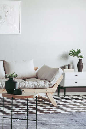 Scandinavian style living room interior with trendy sofa, wooden table and white shelf with vase
