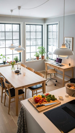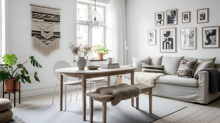A stylish, contemporary living room featuring a dining area with a wooden table, bench, and chairs. Large windows allow ample natural light, while decorative elements like plants, cushions, and wall art enhance the space.