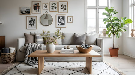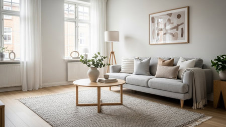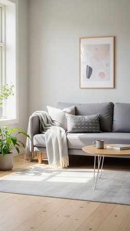 showing cozy scandinavian living room with gray sofa and natural wood coffee table illuminated by soft sunlight streaming through window. resolution...