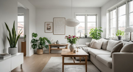 scandinavian living room, with minimalist decor and sleek furnishings, created with generative ai