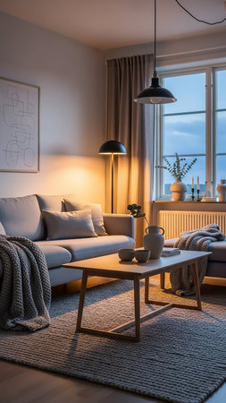 A cozy living room a light grey sofa and wooden coffee table. A warm floor lamp casts a soft glow, creating a comfortable and inviting atmosphere.