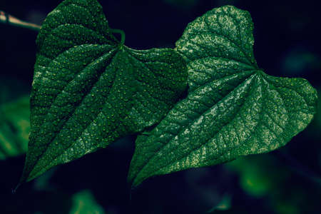 A macro shot of vibrant green leaves with a unique texture and detailed veins. The dark moody lighting creates a dramatic and natural abstract background.
