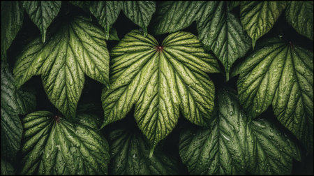 A close-up captures lush green leaves showcasing detailed textures and subtle water droplets. The image employs a shallow depth of field, with a dark background enhancing the vibrant colors. The natural lighting and composition suggest a natural environment, suitable for various editorial and commercial applications.