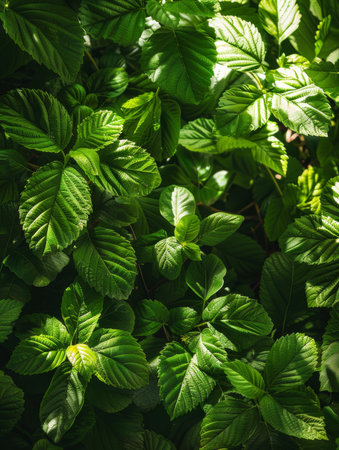 A detailed close-up of vibrant green leaves showcasing varying shades and rich textures. The interplay of natural light highlights the lush foliage, emphasizing the beauty of nature.