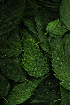 Dark green leaves of Strawberry in dew, natural background of nature. Texture of the leaves. Leaves green background.