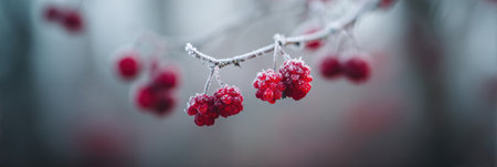 Red berries coated in frost clinging to a branch during early morning light in a serene winter setting, creating a peaceful and beautiful atmosphere.