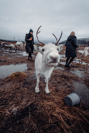 White reindeer looking at camera in the arctic near Tromso, Norway