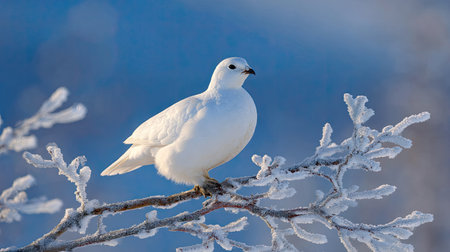 A beautiful white bird sits gracefully on a frosty tree branch, surrounded by a serene winter landscape. The delicate feathers contrast with the icy environment, capturing nature's beauty.