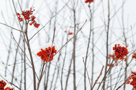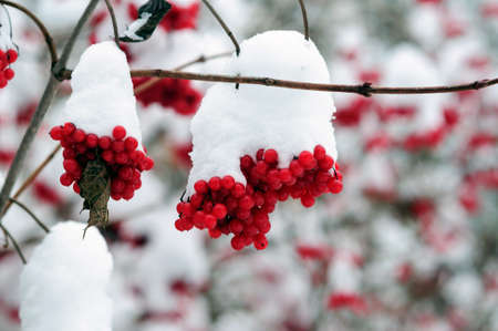red bunches branch of rowan covered with first winter snow