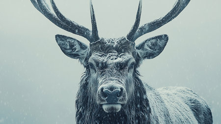 Majestic stag standing alone in a foggy white landscape, embodying strength and solitude in nature. A captivating wildlife scene showcasing its impressive antlers.