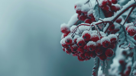 A branch of red berries covered in snow. The image has a peaceful and serene mood
