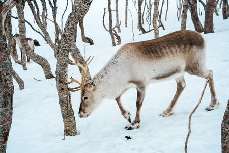 A reindeer walking through a snowy forest with birch trees. Tromso, Norway
